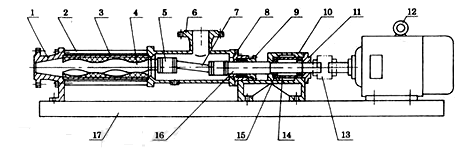 1 出料腔 2 拉桿 3 螺桿膠套 4 螺桿軸 5 萬向節(jié)總成 6 吸入口體