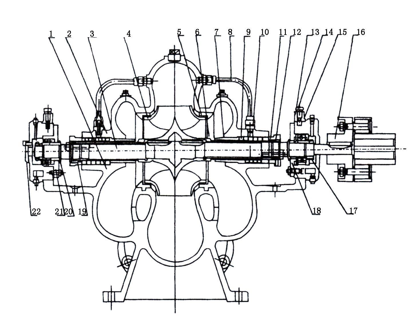 5、泵軸由兩個單列向心球軸承支承,軸承裝在泵體兩端的軸承體內(nèi),用黃油潤滑,雙吸密封環(huán)用以減少水泵壓水室的水漏回吸水室。