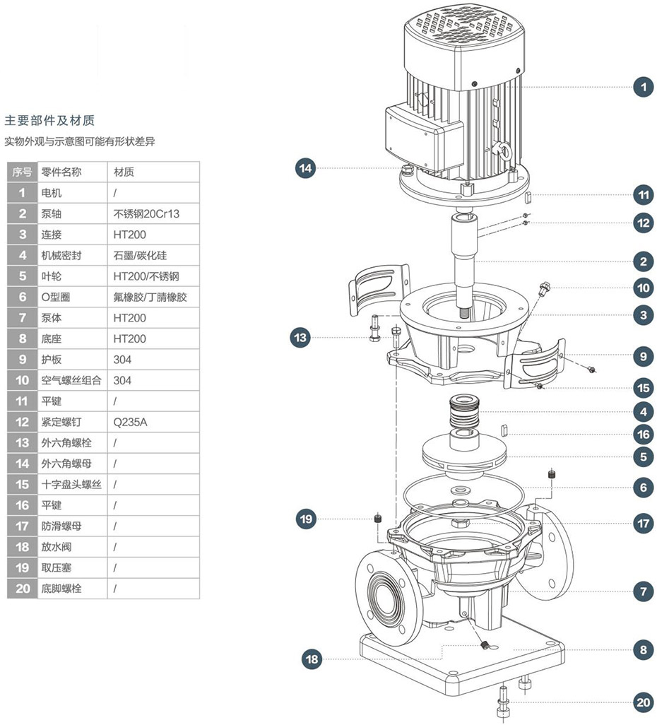 2、所輸送介質(zhì)中固體顆粒體積含量不超過(guò)單位體積的0.1%,粒度<0.2mm. 注:如使用介質(zhì)為帶有細(xì)小顆粒,請(qǐng)?jiān)谟嗀洉r(shí)說(shuō)明,以便采用耐磨式機(jī)械密封。